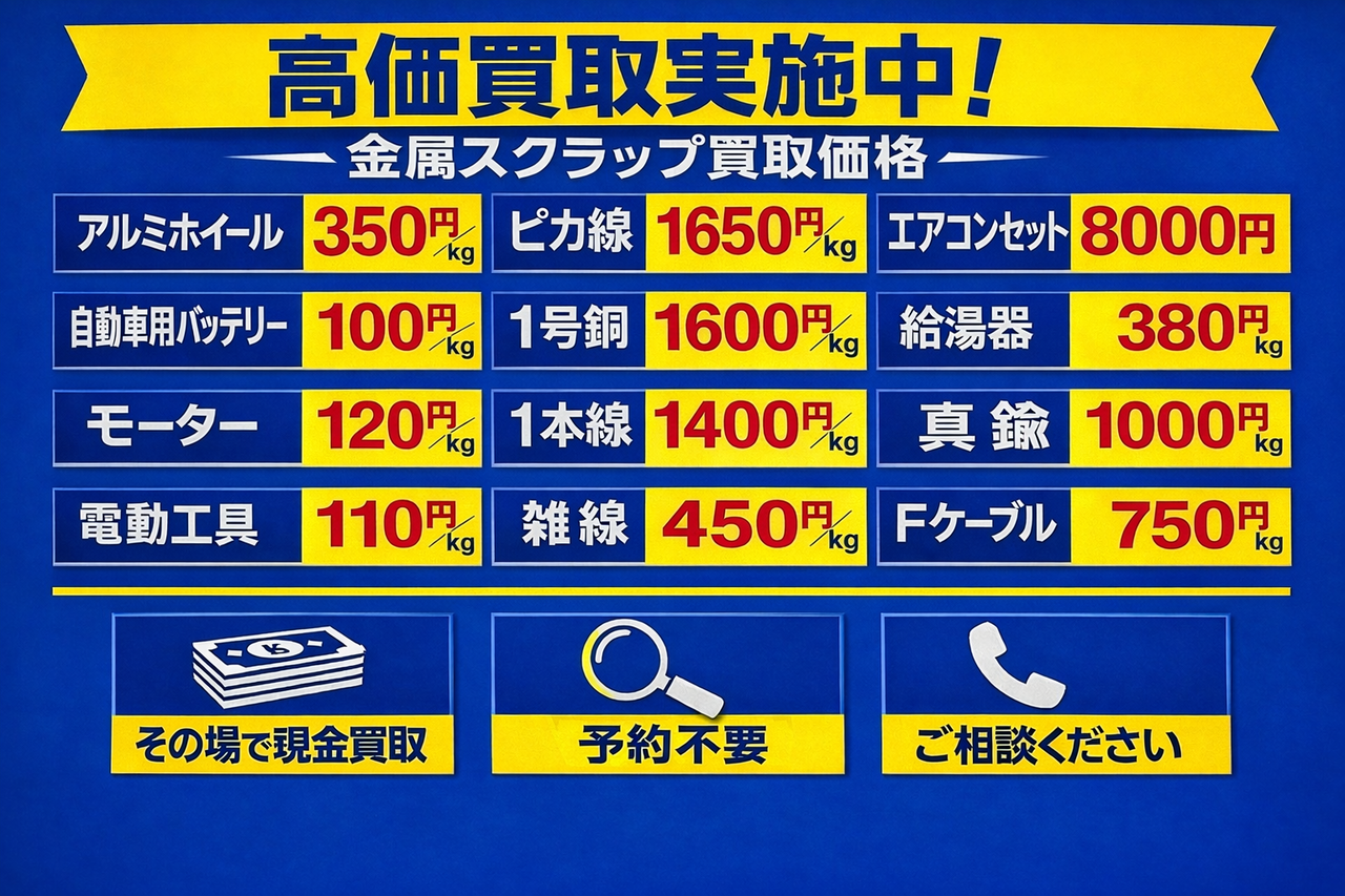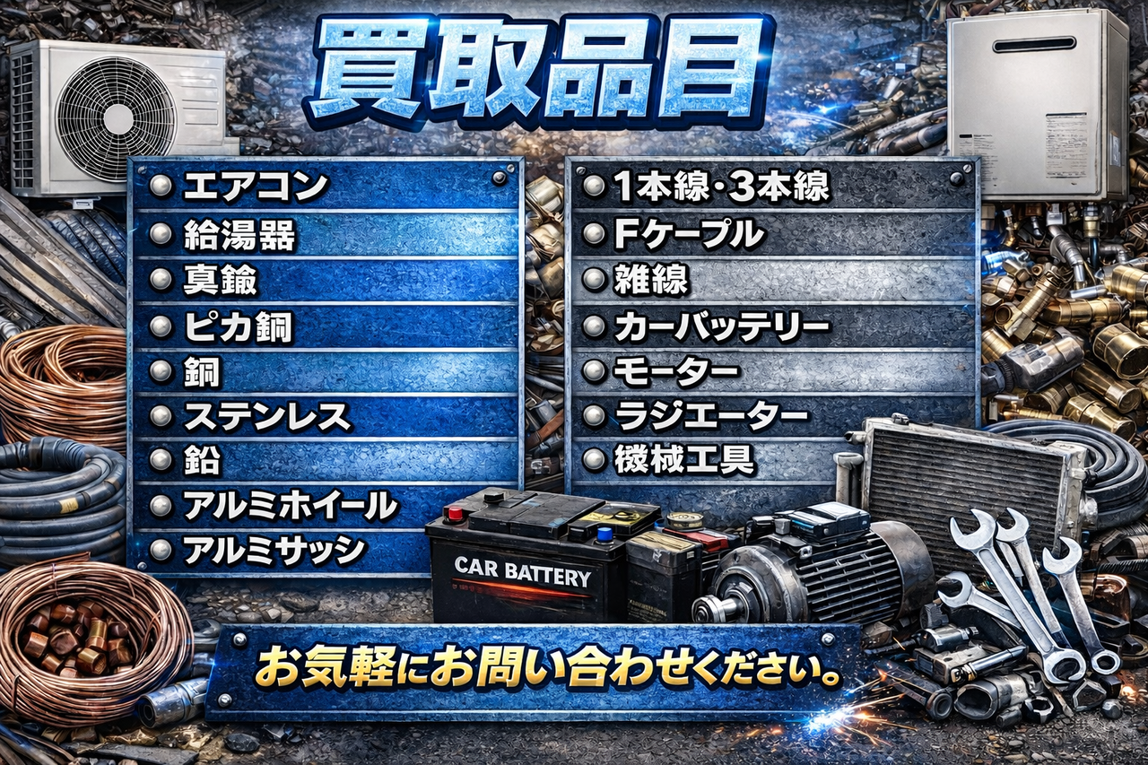 エアコン・給湯器・真鍮・ピカ線・雑線・電線・銅・アルミ・なまり・ステンレス・バッテリー・アルミホイル等非鉄金属スクラップを買い取ります。